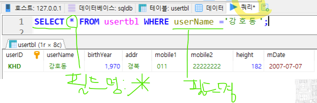 ex) SELECT * FROM userTBL WHERE userName = '๊ฐํธ๋';