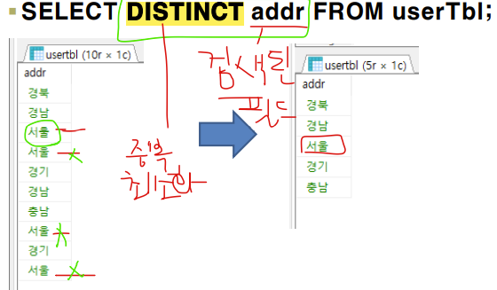 --DISTINCT๋ ์ค๋ณต์ต์ํ, addr๋ ๊ฒ์๋ ํ๋