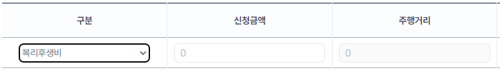 ๋ณต๋ฆฌํ์๋น, ์ฌ๋น๊ตํต๋น, ๊ธฐํ ์ ํ ์ '์ฃผํ๊ฑฐ๋ฆฌ' input ๋นํ์ฑํํ๊ณ '์ ์ฒญ๊ธ์ก'๋ง ํ์ฑํ,