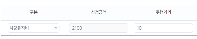 โ ์ต์ข ๊ฒฐ๊ณผ : ์ฐจ๋์ ์ง๋น๋ฅผ ์ ํํ๋ฉด ์ ์ฒญ๊ธ์ก input์ด disabled์ฒ๋ฆฌ๋๊ณ , ์ฃผํ๊ฑฐ๋ฆฌ๋ฅผ ์ ๋ ฅํ๋ฉด ์ฃผ์ ํ์ค๋จ๊ฐ๋ก ๊ณ์ฐ๋์ด ์ ์ฒญ๊ธ์ก์ ์ฐํ๋๋ก ์์ฑํ์๋ค.