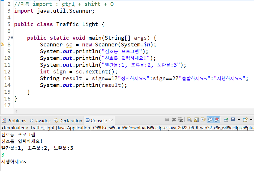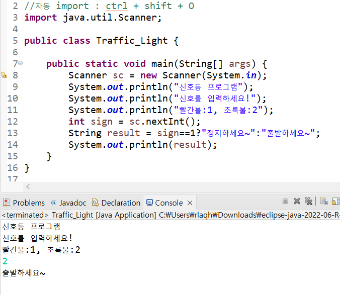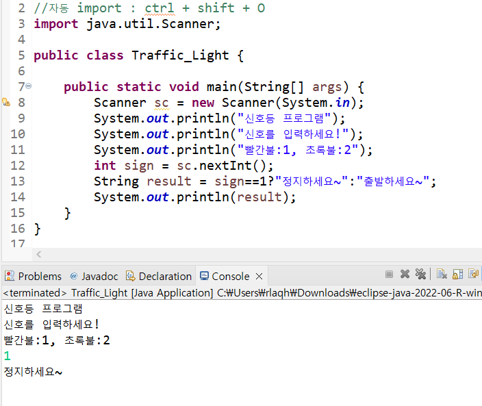 System.out.println("๋นจ๊ฐ๋ถ:1, ์ด๋ก๋ถ:2, ๋