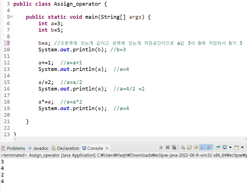 ์ ์ฅ๊ณต๊ฐ = ๊ฐ; // '์ค๋ฅธ์ชฝ์ ์๋ ๊ฐ์ ์ผ์ชฝ ์ ์ฅ๊ณต๊ฐ์ ์ ์ฅํด๋ผ' ๋ผ๋ ๋ป