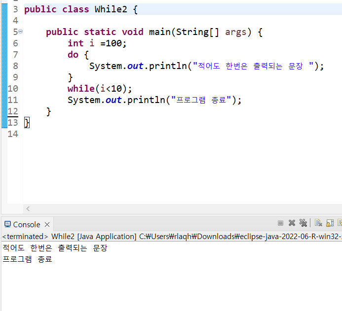 : while문은 조건식의 결과값이 거짓이라면 단 한번도 실행되지 않고 종료하지만