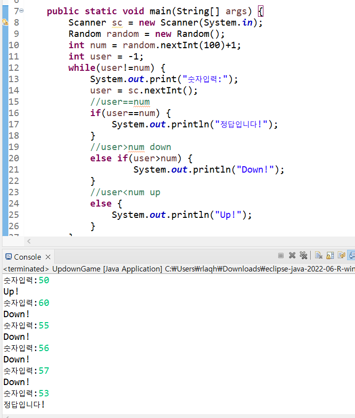 - 랜덤숫자> 입력 값 : Up 출력 후 반복
